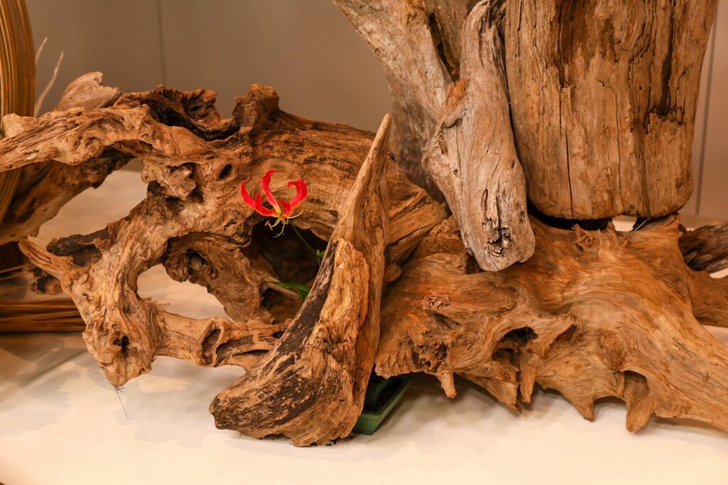 問いかけのかたち は、花・竹・流木・枝・光など自然素材を組み合わせた象徴的空間作品です。